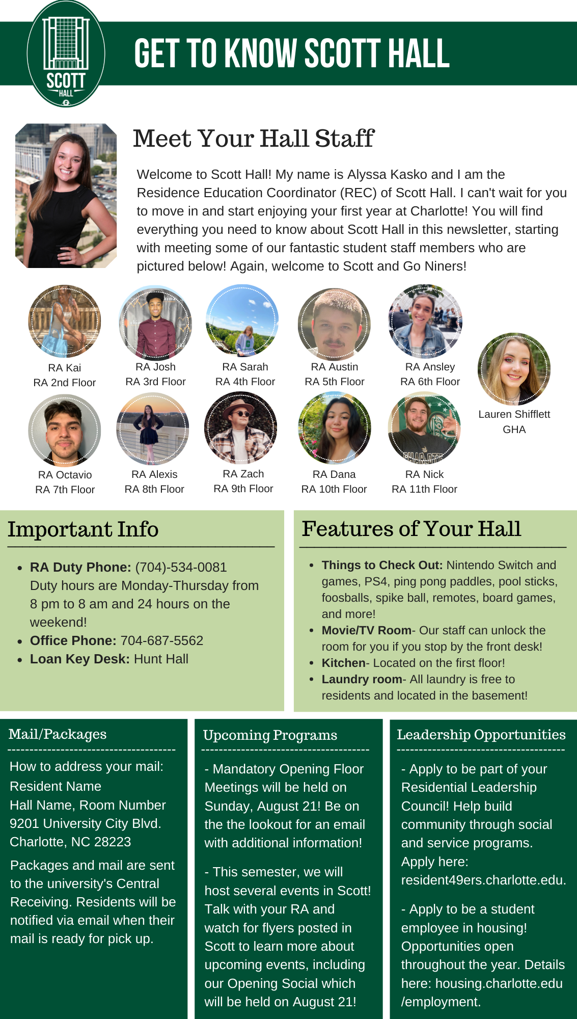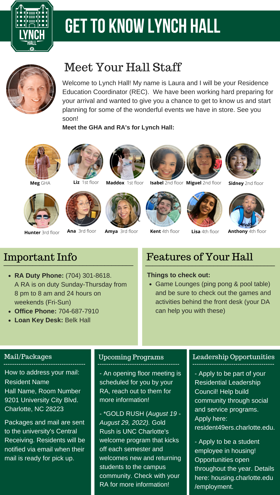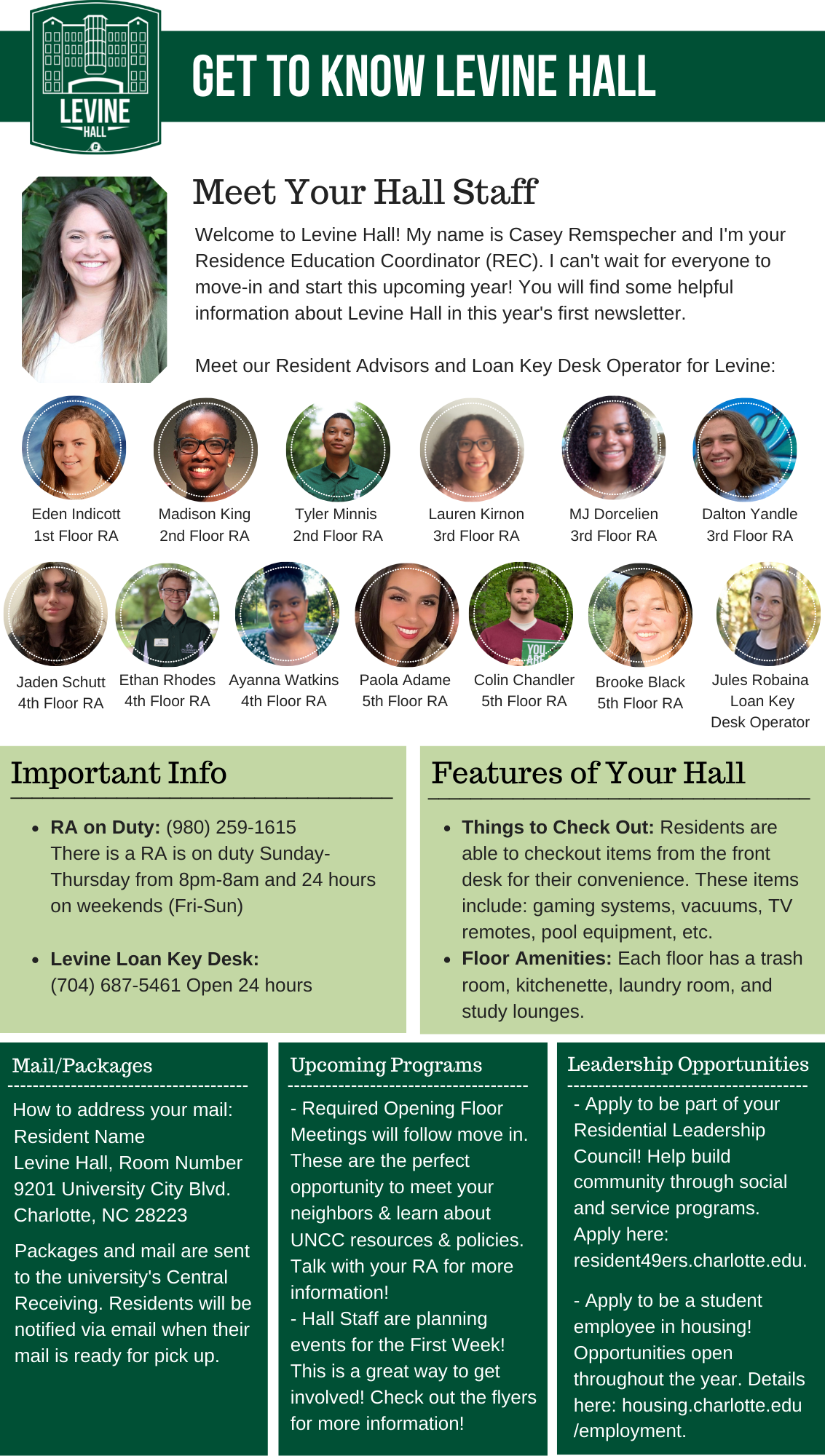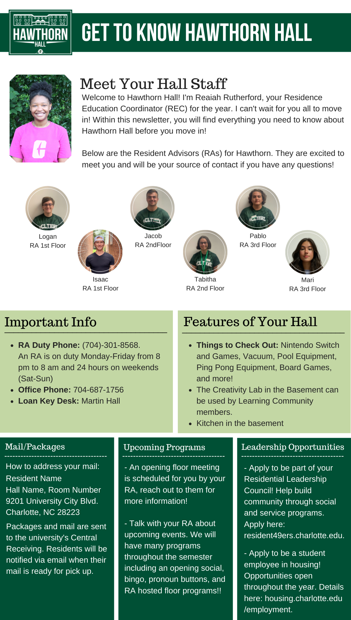 Please find your hall's Welcome Newsletter below: Belk Hall Greek Village Hawthorn Hall Holshouser Hall Hunt Hall Laurel Hall Levine Hall Lynch Hall Martin Hall Miltimore Hall The Grove (Oak, Elm and Pine Halls) Sanford Hall Scott Hall Wallis Hall Witherspoon Hall